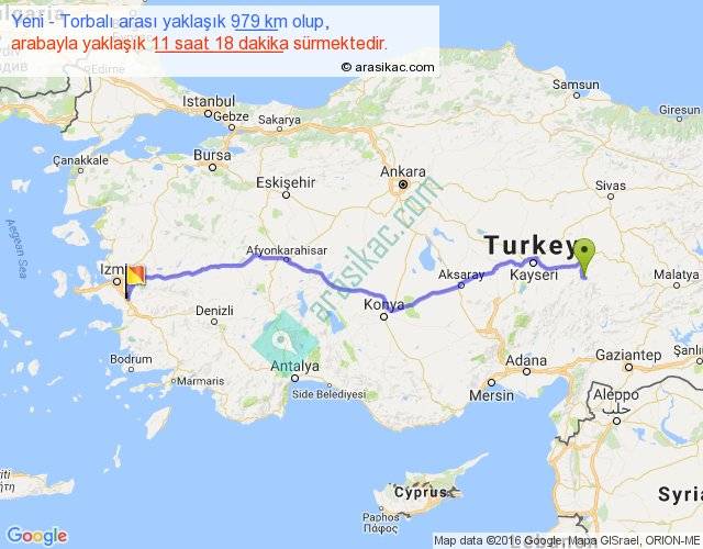 Yeni - Torbalı arası yaklaşık olarak 90 km/h ile yukarıda belirtilen sürede olup, iki yerin kuş uçuşu uzaklığı (mesafesi) 793'dir. Eğer belirtilen yerler arasında uçak seferi var ise bu süre uçakla 1 saat 13 dakika'ya kadar düşebilir. Yolculuk otobüsle 14 saat 41 dakika sürmektedir.