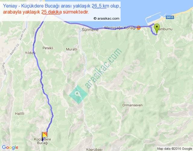 Yeniay - Küçükdere Bucağı arası yaklaşık olarak 90 km/h ile yukarıda belirtilen sürede olup, iki yerin kuş uçuşu uzaklığı (mesafesi) 15'dir. Yolculuk otobüsle 32 dakika sürmektedir.