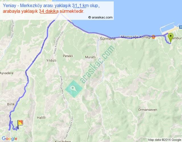 Yeniay - Merkezköy arası yaklaşık olarak 90 km/h ile yukarıda belirtilen sürede olup, iki yerin kuş uçuşu uzaklığı (mesafesi) 18'dir. Yolculuk otobüsle 44 dakika sürmektedir.