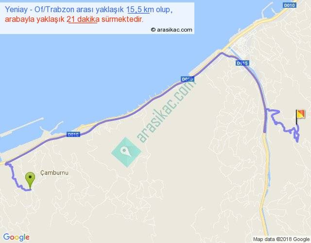 Yeniay - Of Trabzon arası yaklaşık olarak 90 km/h ile yukarıda belirtilen sürede olup, iki yerin kuş uçuşu uzaklığı (mesafesi) 8'dir. Yolculuk otobüsle 27 dakika sürmektedir.