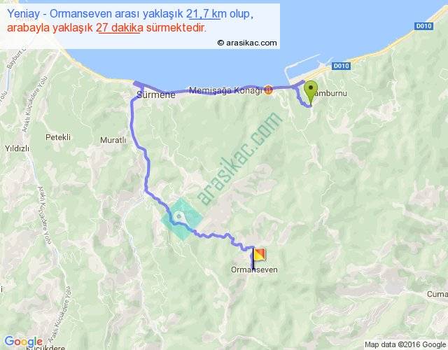 Yeniay - Ormanseven arası yaklaşık olarak 90 km/h ile yukarıda belirtilen sürede olup, iki yerin kuş uçuşu uzaklığı (mesafesi) 7'dir. Yolculuk otobüsle 35 dakika sürmektedir.