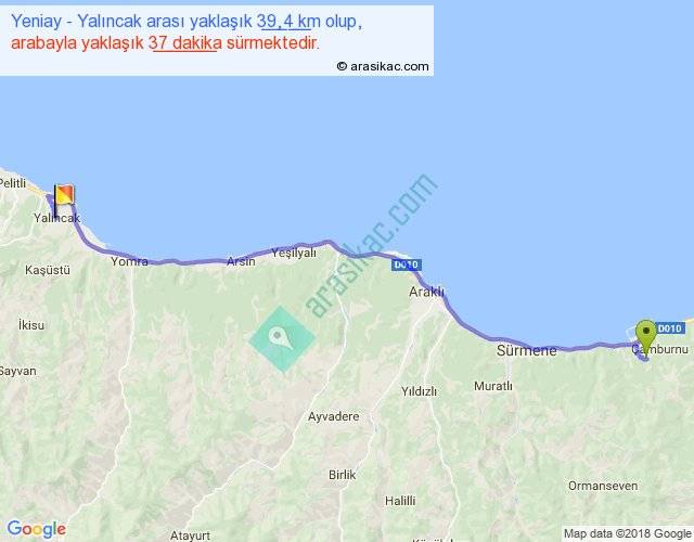 Yeniay - Yalıncak arası yaklaşık olarak 90 km/h ile yukarıda belirtilen sürede olup, iki yerin kuş uçuşu uzaklığı (mesafesi) 32'dir. Yolculuk otobüsle 48 dakika sürmektedir.
