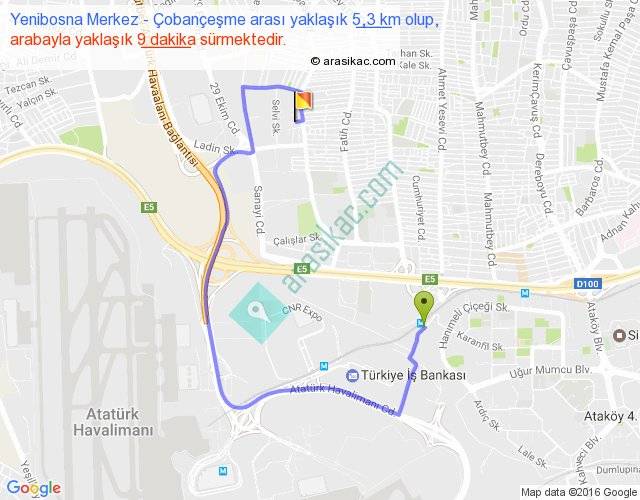 Yenibosna Merkez - Çobançeşme arası yaklaşık olarak 90 km/h ile yukarıda belirtilen sürede olup, iki yerin kuş uçuşu uzaklığı (mesafesi) 2'dir. Yolculuk otobüsle 11 dakika sürmektedir.
