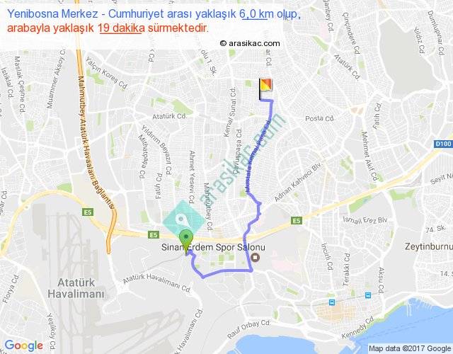 Yenibosna Merkez - Cumhuriyet arası yaklaşık olarak 90 km/h ile yukarıda belirtilen sürede olup, iki yerin kuş uçuşu uzaklığı (mesafesi) 3'dir. Yolculuk otobüsle 24 dakika sürmektedir.