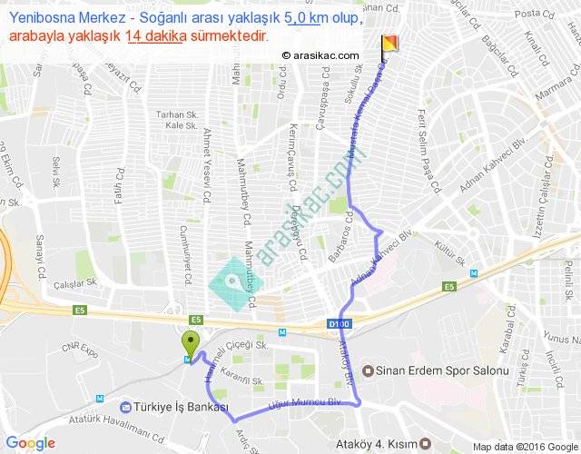Yenibosna Merkez - Soğanlı arası yaklaşık olarak 90 km/h ile yukarıda belirtilen sürede olup, iki yerin kuş uçuşu uzaklığı (mesafesi) 3'dir. Yolculuk otobüsle 18 dakika sürmektedir.