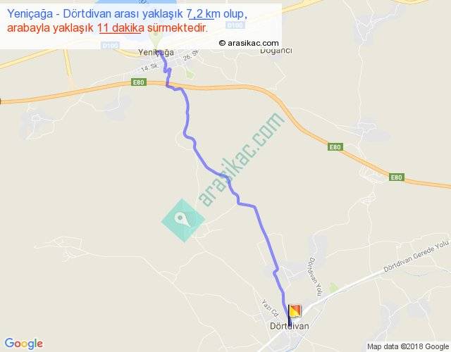 Yeniçağa - Dörtdivan arası yaklaşık olarak 90 km/h ile yukarıda belirtilen sürede olup, iki yerin kuş uçuşu uzaklığı (mesafesi) 6'dir. Yolculuk otobüsle 13 dakika sürmektedir.