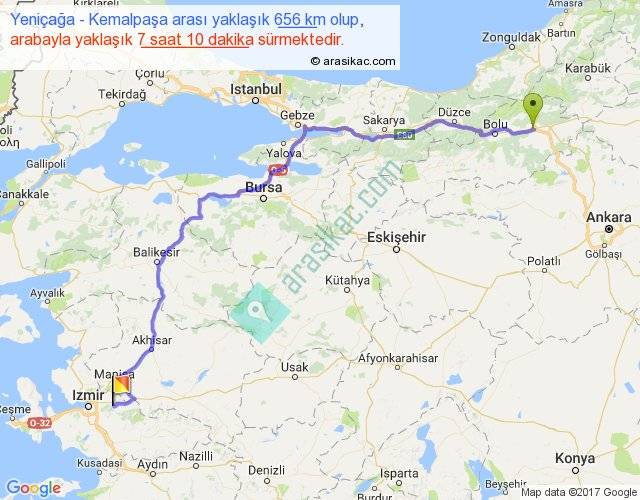 Yeniçağa - Kemalpaşa arası yaklaşık olarak 90 km/h ile yukarıda belirtilen sürede olup, iki yerin kuş uçuşu uzaklığı (mesafesi) 470'dir. Eğer belirtilen yerler arasında uçak seferi var ise bu süre uçakla 43 dakika'ya kadar düşebilir. Yolculuk otobüsle 9 saat 19 dakika sürmektedir.