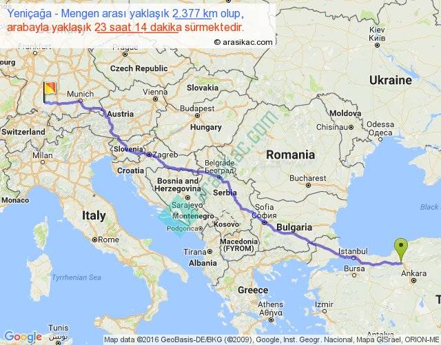 Yeniçağa - Mengen arası yaklaşık olarak 90 km/h ile yukarıda belirtilen sürede olup, iki yerin kuş uçuşu uzaklığı (mesafesi) 1955'dir. Eğer belirtilen yerler arasında uçak seferi var ise bu süre uçakla 3 saat 00 dakika'ya kadar düşebilir. Yolculuk otobüsle 1 gün 6 saat sürmektedir.