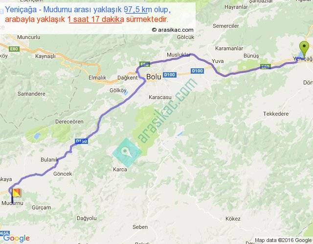 Yeniçağa - Mudurnu arası yaklaşık olarak 90 km/h ile yukarıda belirtilen sürede olup, iki yerin kuş uçuşu uzaklığı (mesafesi) 77'dir. Yolculuk otobüsle 1 saat 40 dakika sürmektedir.