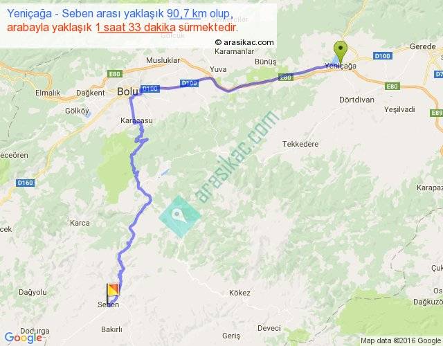 Yeniçağa - Seben arası yaklaşık olarak 90 km/h ile yukarıda belirtilen sürede olup, iki yerin kuş uçuşu uzaklığı (mesafesi) 55'dir. Yolculuk otobüsle 2 saat 0 dakika sürmektedir.