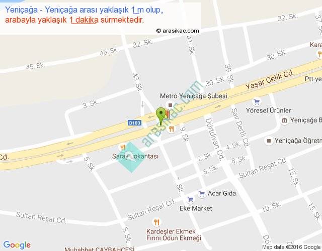 Yeniçağa - Yeniçağa arası yaklaşık olarak 90 km/h ile yukarıda belirtilen sürede olup, iki yerin kuş uçuşu uzaklığı (mesafesi) 0'dir. Yolculuk otobüsle 1 dakika sürmektedir.