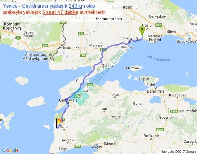 Yenice - Geyikli arası yaklaşık olarak 90 km/h ile yukarıda belirtilen sürede olup, iki yerin kuş uçuşu uzaklığı (mesafesi) 187'dir. Yolculuk otobüsle 4 saat 55 dakika sürmektedir.