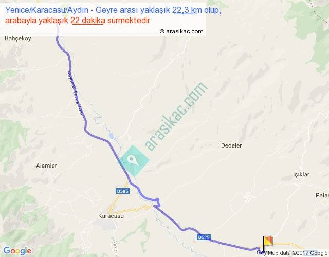 Yenice Karacasu Aydın - Geyre arası yaklaşık olarak 90 km/h ile yukarıda belirtilen sürede olup, iki yerin kuş uçuşu uzaklığı (mesafesi) 18'dir. Yolculuk otobüsle 28 dakika sürmektedir.