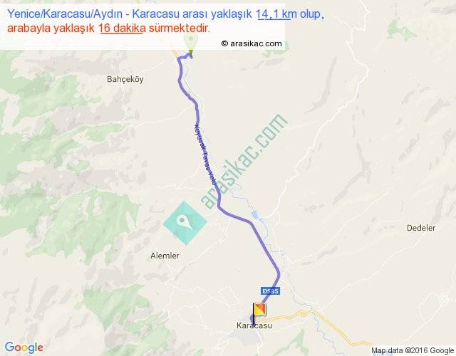 Yenice Karacasu Aydın - Karacasu arası yaklaşık olarak 90 km/h ile yukarıda belirtilen sürede olup, iki yerin kuş uçuşu uzaklığı (mesafesi) 12'dir. Yolculuk otobüsle 20 dakika sürmektedir.