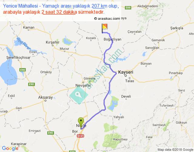 Yenice Mahallesi - Yamaçlı arası yaklaşık olarak 90 km/h ile yukarıda belirtilen sürede olup, iki yerin kuş uçuşu uzaklığı (mesafesi) 153'dir. Yolculuk otobüsle 3 saat 17 dakika sürmektedir.