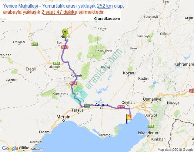 Yenice Mahallesi - Yumurtalık arası yaklaşık olarak 90 km/h ile yukarıda belirtilen sürede olup, iki yerin kuş uçuşu uzaklığı (mesafesi) 165'dir. Yolculuk otobüsle 3 saat 37 dakika sürmektedir.