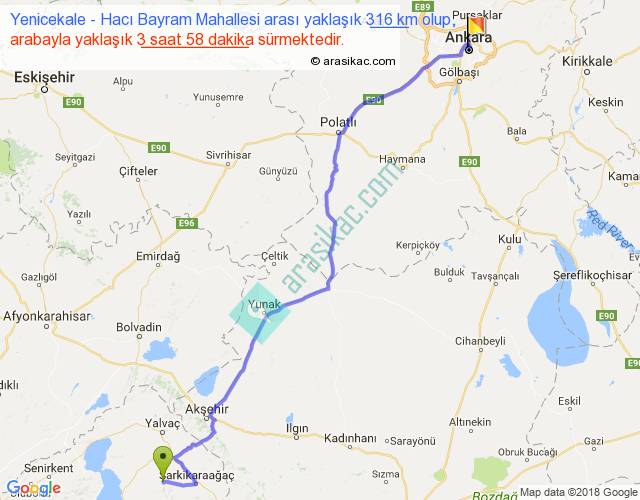 Yenicekale - Hacı Bayram Mahallesi arası yaklaşık olarak 90 km/h ile yukarıda belirtilen sürede olup, iki yerin kuş uçuşu uzaklığı (mesafesi) 251'dir. Eğer belirtilen yerler arasında uçak seferi var ise bu süre uçakla 23 dakika'ya kadar düşebilir. Yolculuk otobüsle 5 saat 9 dakika sürmektedir.
