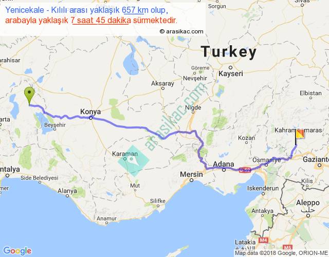 Yenicekale - Kılılı arası yaklaşık olarak 90 km/h ile yukarıda belirtilen sürede olup, iki yerin kuş uçuşu uzaklığı (mesafesi) 504'dir. Eğer belirtilen yerler arasında uçak seferi var ise bu süre uçakla 46 dakika'ya kadar düşebilir. Yolculuk otobüsle 10 saat 4 dakika sürmektedir.