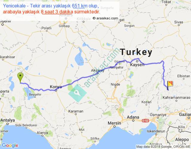 Yenicekale - Tekir arası yaklaşık olarak 90 km/h ile yukarıda belirtilen sürede olup, iki yerin kuş uçuşu uzaklığı (mesafesi) 474'dir. Eğer belirtilen yerler arasında uçak seferi var ise bu süre uçakla 43 dakika'ya kadar düşebilir. Yolculuk otobüsle 10 saat 27 dakika sürmektedir.