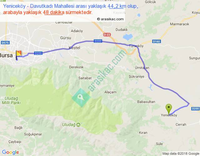 Yeniceköy - Davutkadı Mahallesi arası yaklaşık olarak 90 km/h ile yukarıda belirtilen sürede olup, iki yerin kuş uçuşu uzaklığı (mesafesi) 30'dir. Yolculuk otobüsle 1 saat 2 dakika sürmektedir.
