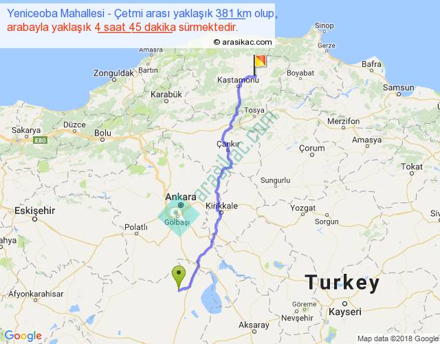 Yeniceoba Mahallesi - Çetmi arası yaklaşık olarak 90 km/h ile yukarıda belirtilen sürede olup, iki yerin kuş uçuşu uzaklığı (mesafesi) 308'dir. Eğer belirtilen yerler arasında uçak seferi var ise bu süre uçakla 28 dakika'ya kadar düşebilir. Yolculuk otobüsle 6 saat 10 dakika sürmektedir.