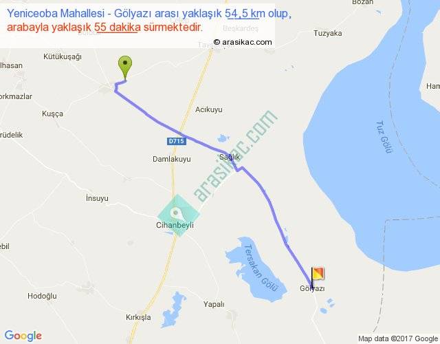 Yeniceoba Mahallesi - Gölyazı arası yaklaşık olarak 90 km/h ile yukarıda belirtilen sürede olup, iki yerin kuş uçuşu uzaklığı (mesafesi) 48'dir. Yolculuk otobüsle 1 saat 11 dakika sürmektedir.