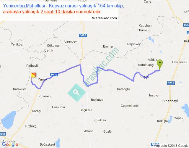 Yeniceoba Mahallesi - Koçyazı arası yaklaşık olarak 90 km/h ile yukarıda belirtilen sürede olup, iki yerin kuş uçuşu uzaklığı (mesafesi) 103'dir. Yolculuk otobüsle 2 saat 49 dakika sürmektedir.