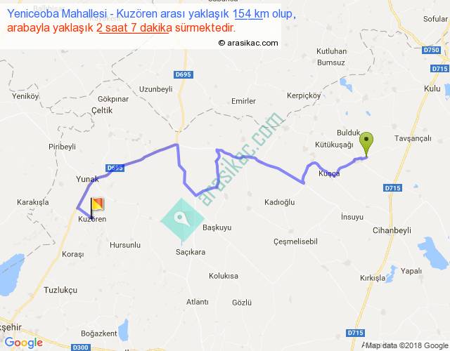 Yeniceoba Mahallesi - Kuzören arası yaklaşık olarak 90 km/h ile yukarıda belirtilen sürede olup, iki yerin kuş uçuşu uzaklığı (mesafesi) 95'dir. Yolculuk otobüsle 2 saat 45 dakika sürmektedir.