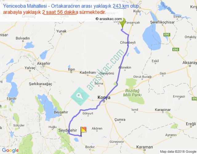 Yeniceoba Mahallesi - Ortakaraören arası yaklaşık olarak 90 km/h ile yukarıda belirtilen sürede olup, iki yerin kuş uçuşu uzaklığı (mesafesi) 178'dir. Yolculuk otobüsle 3 saat 48 dakika sürmektedir.