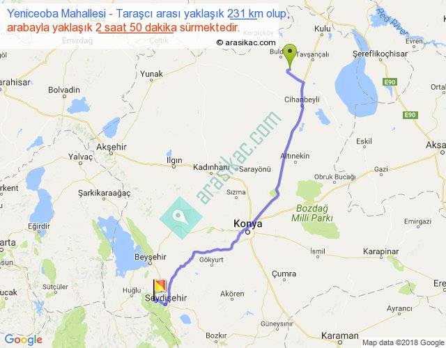 Yeniceoba Mahallesi - Taraşcı arası yaklaşık olarak 90 km/h ile yukarıda belirtilen sürede olup, iki yerin kuş uçuşu uzaklığı (mesafesi) 184'dir. Yolculuk otobüsle 3 saat 41 dakika sürmektedir.