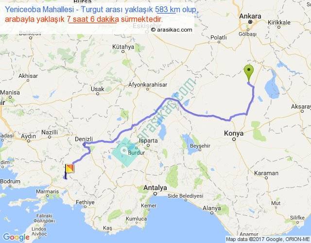 Yeniceoba Mahallesi - Turgut arası yaklaşık olarak 90 km/h ile yukarıda belirtilen sürede olup, iki yerin kuş uçuşu uzaklığı (mesafesi) 407'dir. Eğer belirtilen yerler arasında uçak seferi var ise bu süre uçakla 37 dakika'ya kadar düşebilir. Yolculuk otobüsle 9 saat 13 dakika sürmektedir.
