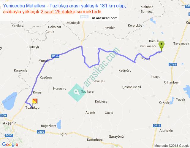 Yeniceoba Mahallesi - Tuzlukçu arası yaklaşık olarak 90 km/h ile yukarıda belirtilen sürede olup, iki yerin kuş uçuşu uzaklığı (mesafesi) 113'dir. Yolculuk otobüsle 3 saat 8 dakika sürmektedir.