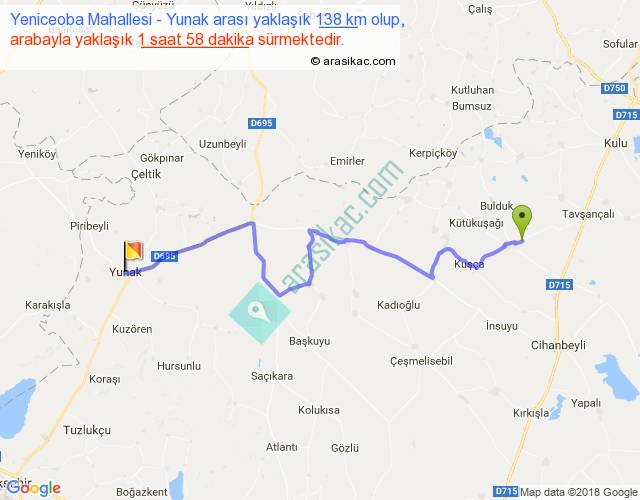 Yeniceoba Mahallesi - Yunak arası yaklaşık olarak 90 km/h ile yukarıda belirtilen sürede olup, iki yerin kuş uçuşu uzaklığı (mesafesi) 94'dir. Yolculuk otobüsle 2 saat 33 dakika sürmektedir.