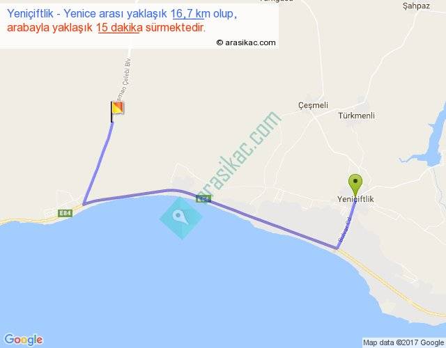 Yeniçiftlik - Yenice arası yaklaşık olarak 90 km/h ile yukarıda belirtilen sürede olup, iki yerin kuş uçuşu uzaklığı (mesafesi) 10'dir. Yolculuk otobüsle 19 dakika sürmektedir.
