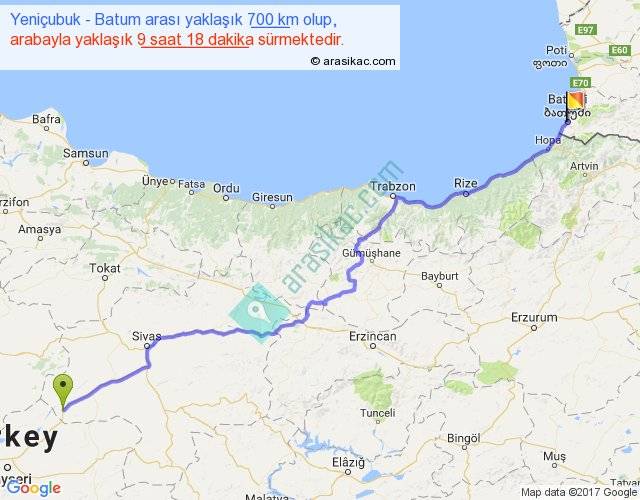 Yeniçubuk - Batum arası yaklaşık olarak 90 km/h ile yukarıda belirtilen sürede olup, iki yerin kuş uçuşu uzaklığı (mesafesi) 537'dir. Eğer belirtilen yerler arasında uçak seferi var ise bu süre uçakla 49 dakika'ya kadar düşebilir. Yolculuk otobüsle 12 saat 5 dakika sürmektedir.