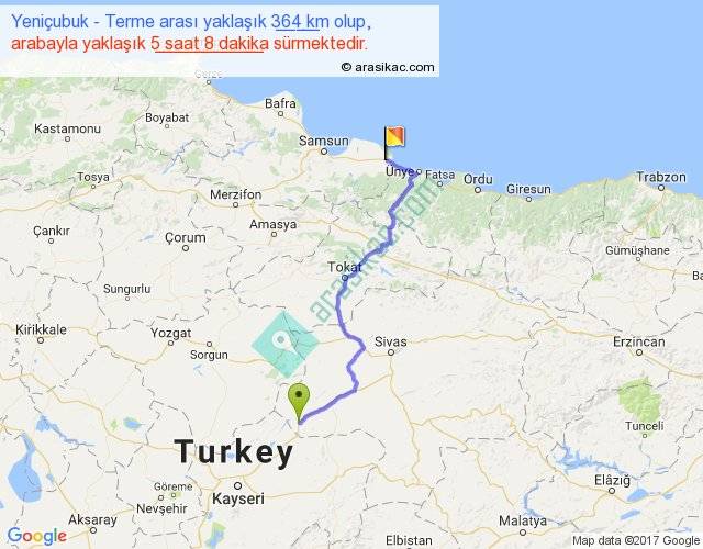 Yeniçubuk - Terme arası yaklaşık olarak 90 km/h ile yukarıda belirtilen sürede olup, iki yerin kuş uçuşu uzaklığı (mesafesi) 233'dir. Yolculuk otobüsle 6 saat 40 dakika sürmektedir.