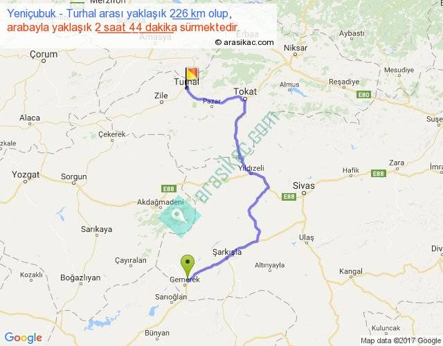 Yeniçubuk - Turhal arası yaklaşık olarak 90 km/h ile yukarıda belirtilen sürede olup, iki yerin kuş uçuşu uzaklığı (mesafesi) 129'dir. Yolculuk otobüsle 3 saat 33 dakika sürmektedir.