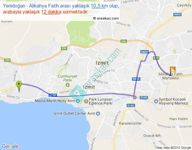 Yenidoğan - Alikahya Fatih arası yaklaşık olarak 90 km/h ile yukarıda belirtilen sürede olup, iki yerin kuş uçuşu uzaklığı (mesafesi) 7'dir. Yolculuk otobüsle 15 dakika sürmektedir.