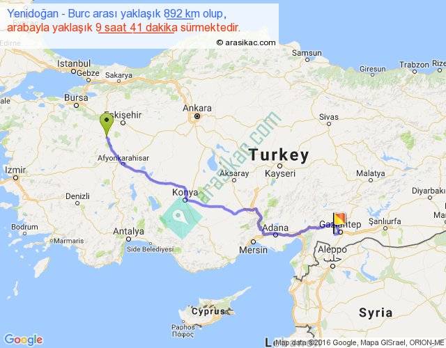 Yenidoğan - Burc arası yaklaşık olarak 90 km/h ile yukarıda belirtilen sürede olup, iki yerin kuş uçuşu uzaklığı (mesafesi) 678'dir. Eğer belirtilen yerler arasında uçak seferi var ise bu süre uçakla 1 saat 02 dakika'ya kadar düşebilir. Yolculuk otobüsle 12 saat 35 dakika sürmektedir.