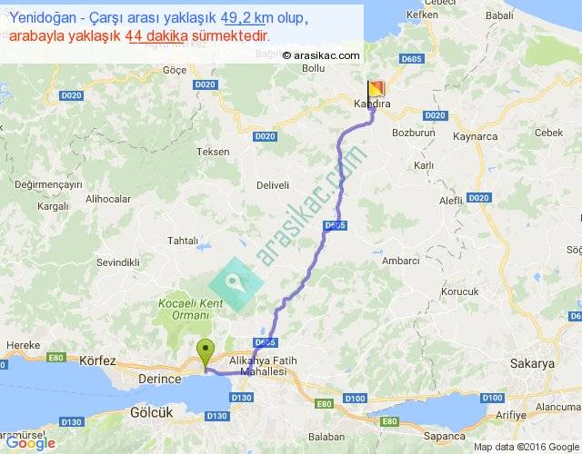 Yenidoğan - Çarşı arası yaklaşık olarak 90 km/h ile yukarıda belirtilen sürede olup, iki yerin kuş uçuşu uzaklığı (mesafesi) 39'dir. Yolculuk otobüsle 57 dakika sürmektedir.