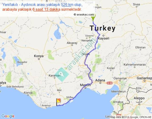 Yenifakılı - Aydıncık arası yaklaşık olarak 90 km/h ile yukarıda belirtilen sürede olup, iki yerin kuş uçuşu uzaklığı (mesafesi) 370'dir. Eğer belirtilen yerler arasında uçak seferi var ise bu süre uçakla 34 dakika'ya kadar düşebilir. Yolculuk otobüsle 8 saat 4 dakika sürmektedir.