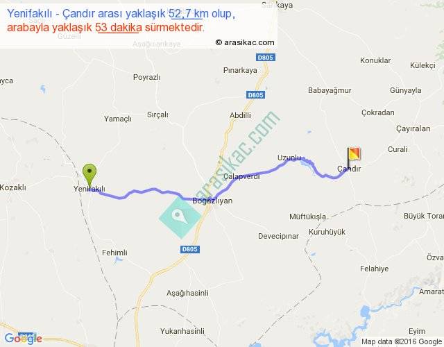 Yenifakılı - Çandır arası yaklaşık olarak 90 km/h ile yukarıda belirtilen sürede olup, iki yerin kuş uçuşu uzaklığı (mesafesi) 44'dir. Yolculuk otobüsle 1 saat 8 dakika sürmektedir.
