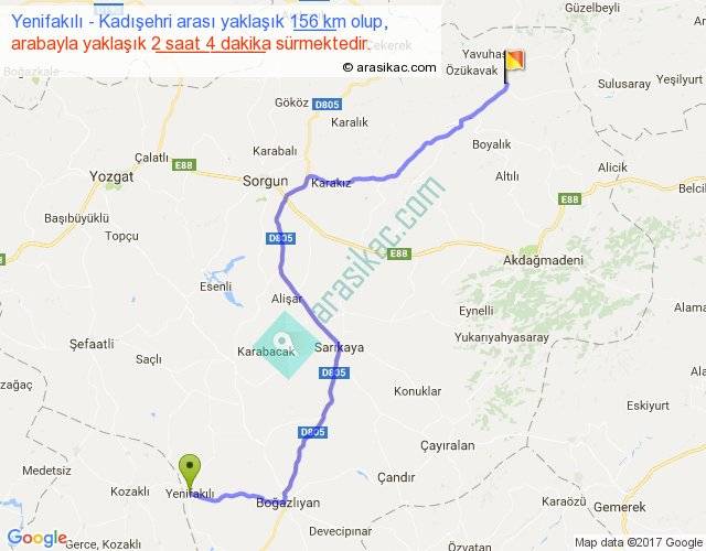 Yenifakılı - Kadışehri arası yaklaşık olarak 90 km/h ile yukarıda belirtilen sürede olup, iki yerin kuş uçuşu uzaklığı (mesafesi) 110'dir. Yolculuk otobüsle 2 saat 37 dakika sürmektedir.