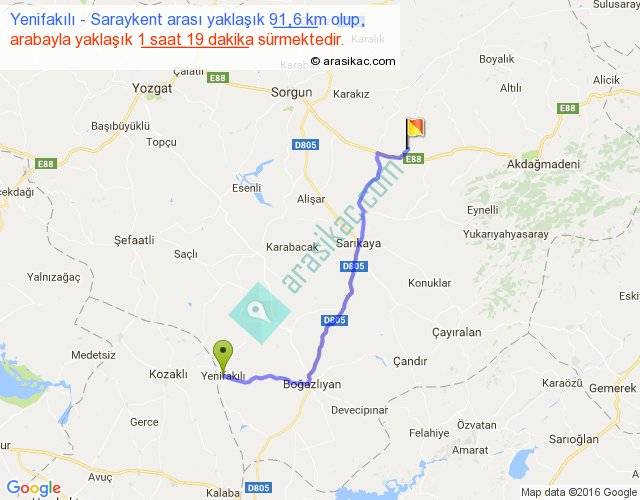 Yenifakılı - Saraykent arası yaklaşık olarak 90 km/h ile yukarıda belirtilen sürede olup, iki yerin kuş uçuşu uzaklığı (mesafesi) 69'dir. Yolculuk otobüsle 1 saat 42 dakika sürmektedir.