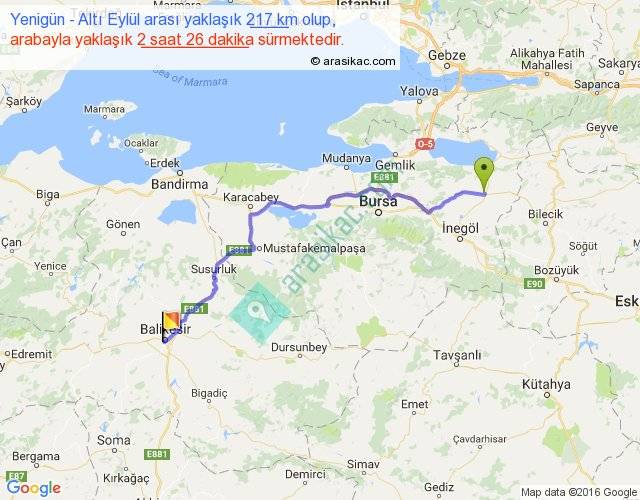 Yenigün - Altı Eylül arası yaklaşık olarak 90 km/h ile yukarıda belirtilen sürede olup, iki yerin kuş uçuşu uzaklığı (mesafesi) 164'dir. Yolculuk otobüsle 3 saat 9 dakika sürmektedir.