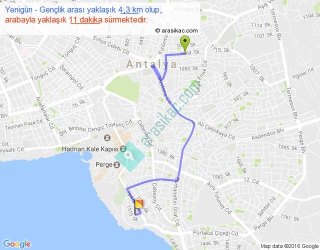 Yenigün - Gençlik arası yaklaşık olarak 90 km/h ile yukarıda belirtilen sürede olup, iki yerin kuş uçuşu uzaklığı (mesafesi) 3'dir. Yolculuk otobüsle 14 dakika sürmektedir.