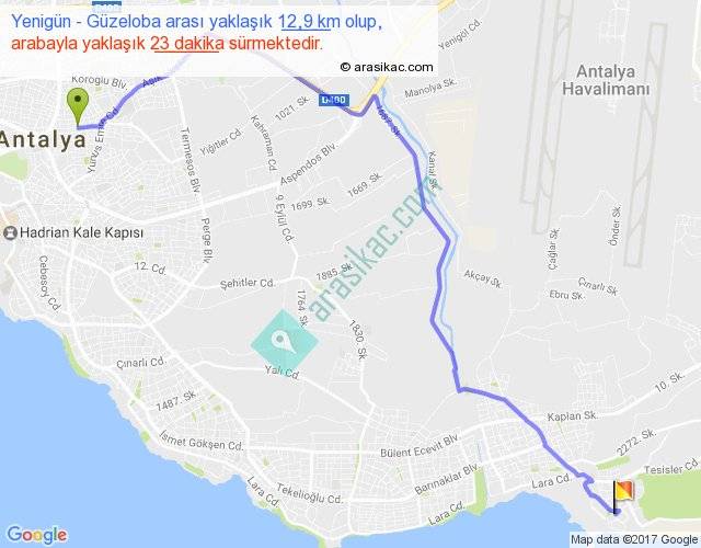 Yenigün - Güzeloba arası yaklaşık olarak 90 km/h ile yukarıda belirtilen sürede olup, iki yerin kuş uçuşu uzaklığı (mesafesi) 9'dir. Yolculuk otobüsle 29 dakika sürmektedir.