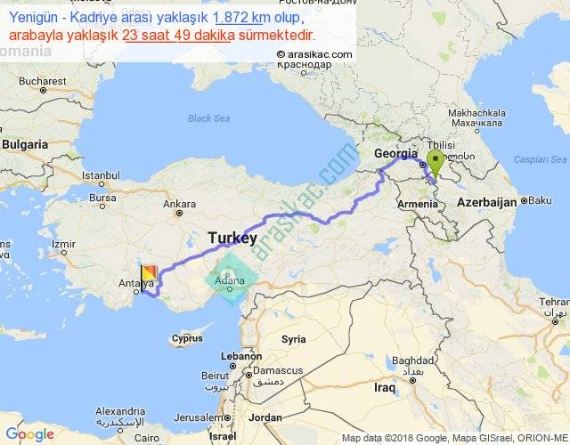 Yenigün - Kadriye arası yaklaşık olarak 90 km/h ile yukarıda belirtilen sürede olup, iki yerin kuş uçuşu uzaklığı (mesafesi) 1325'dir. Eğer belirtilen yerler arasında uçak seferi var ise bu süre uçakla 2 saat 02 dakika'ya kadar düşebilir. Yolculuk otobüsle 1 gün 6 saat sürmektedir.