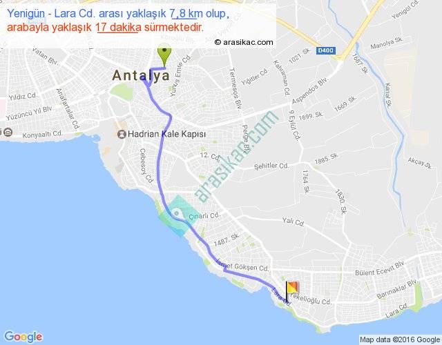 Yenigün - Lara Cd. arası yaklaşık olarak 90 km/h ile yukarıda belirtilen sürede olup, iki yerin kuş uçuşu uzaklığı (mesafesi) 6'dir. Yolculuk otobüsle 22 dakika sürmektedir.