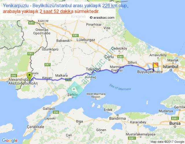 Yenikarpuzlu - Beylikdüzü Istanbul arası yaklaşık olarak 90 km/h ile yukarıda belirtilen sürede olup, iki yerin kuş uçuşu uzaklığı (mesafesi) 198'dir. Yolculuk otobüsle 3 saat 43 dakika sürmektedir.